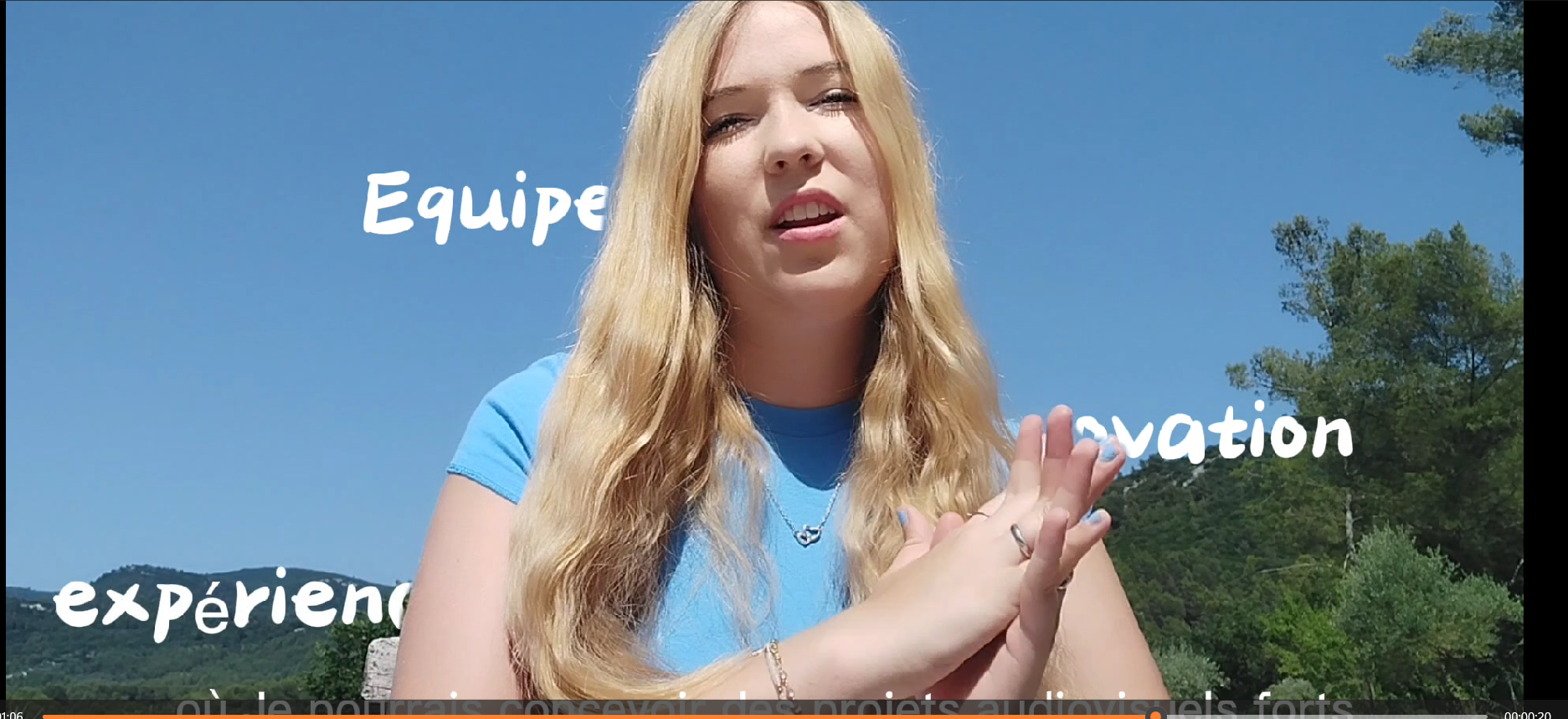 La réalisation de ce CV vidéo m’a amenée à travailler plusieurs étapes : réflexion sur le message à transmettre, écriture d’un scénario, choix des images, montage et habillage sonore. Chaque élément a été pensé pour construire une identité visuelle cohérente et refléter ma personnalité.
