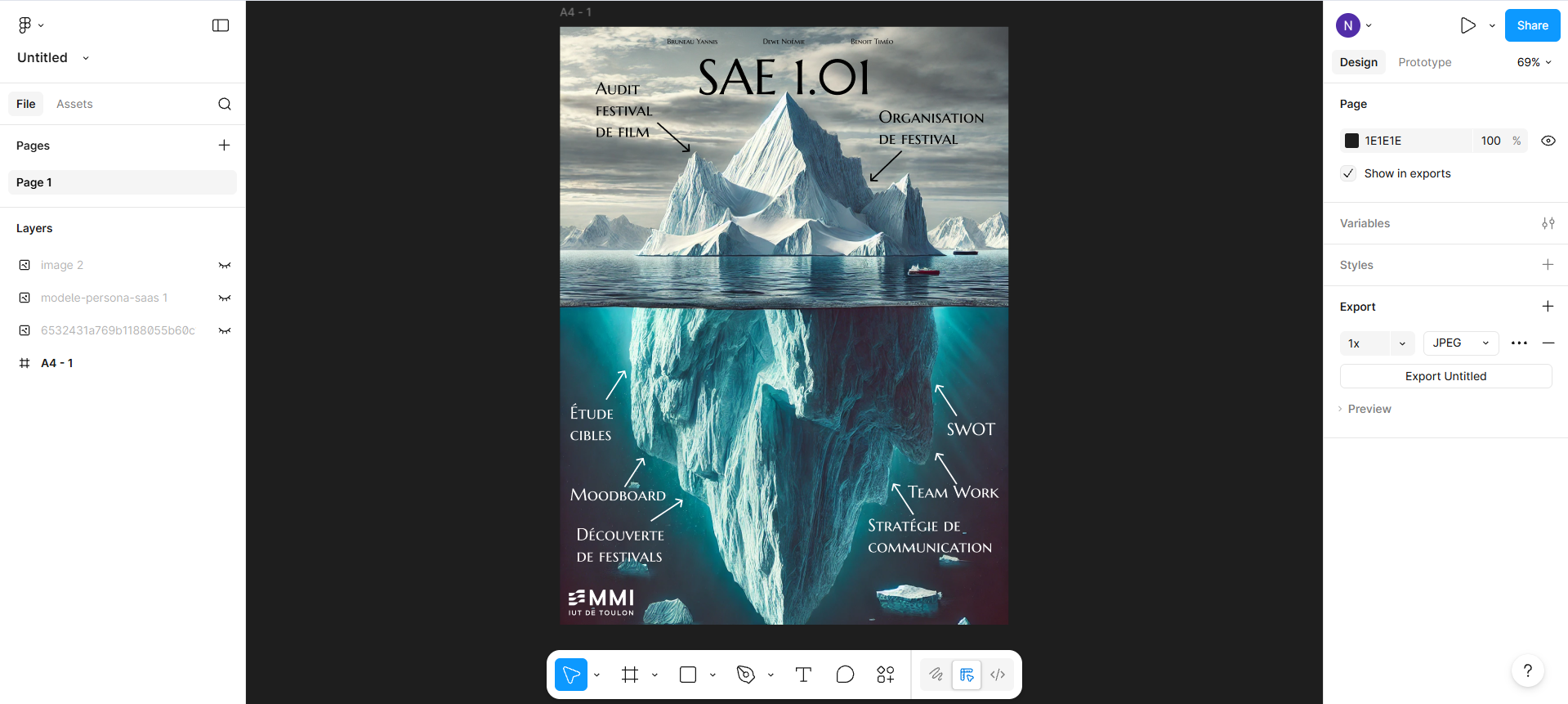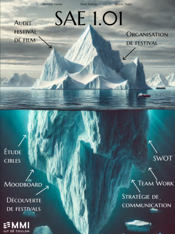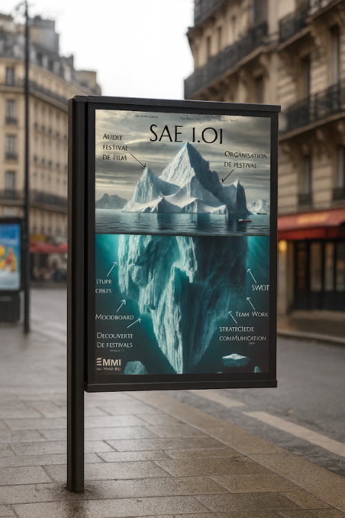 Dans le cadre de ce projet, nous avons également conçu une affiche conceptuelle représentant un iceberg. Cette métaphore visuelle illustre la différence entre ce qui est plus ressorti dans la SAE et tout le travail moins perceptible mais essentiel qui se déroule en coulisses (analyse, stratégie, organisation, étude des cibles, travail d’équipe). Le choix de l’iceberg permet de rendre plus lisible et symbolique la complexité d’un projet culturel, en montrant que la partie la plus importante du travail est souvent invisible au premier regard.