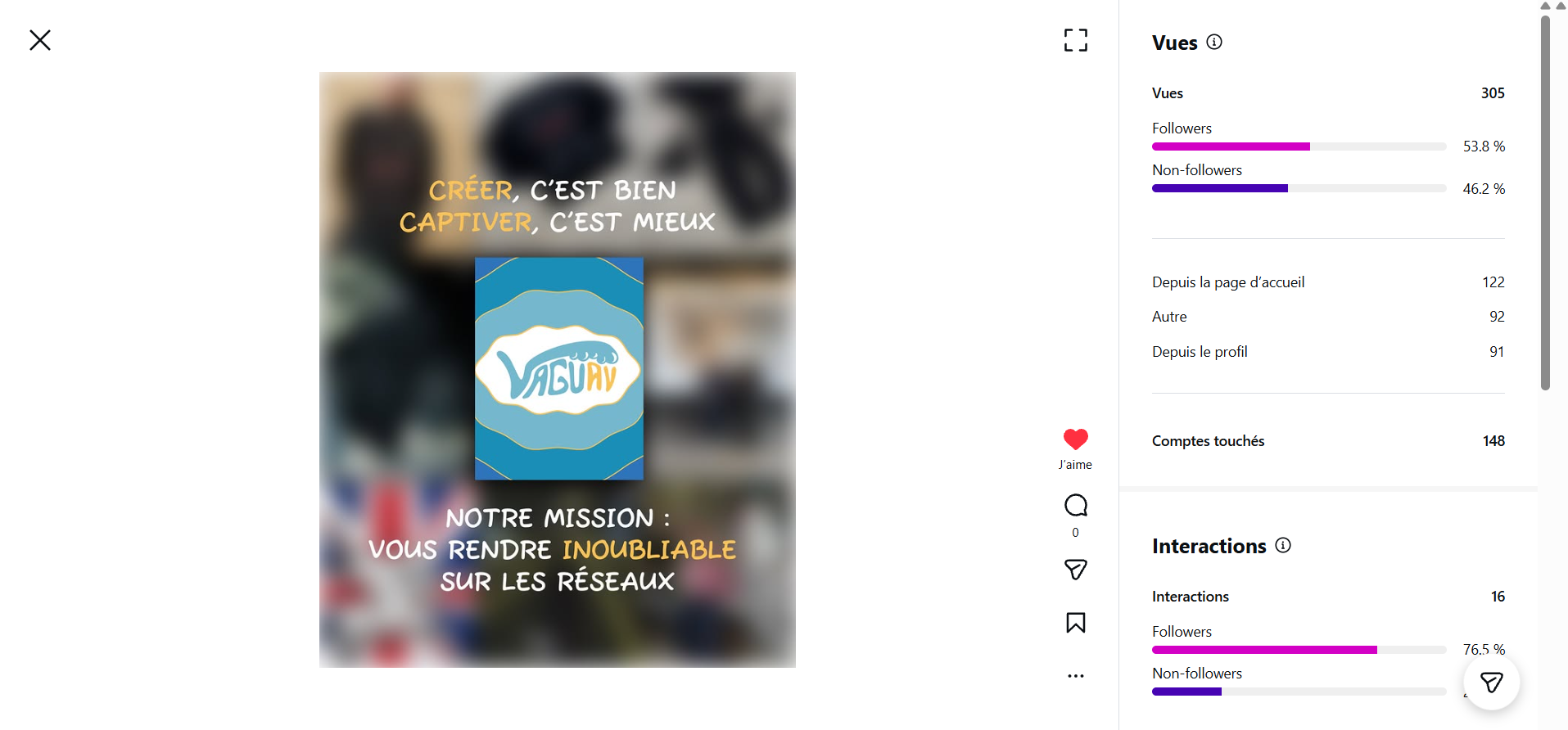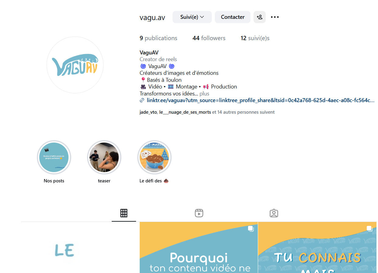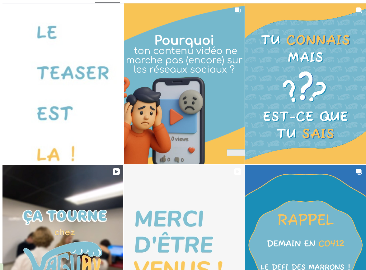 Nous avons conçu différents formats de contenus (posts, visuels, vidéos, stories) afin de dynamiser la page Instagram de Vaguav. Les publications ont été réalisées en prenant en compte la composition visuelle, le rythme de publication et l’impact visuel du feed, dans une logique de valorisation des projets audiovisuels.