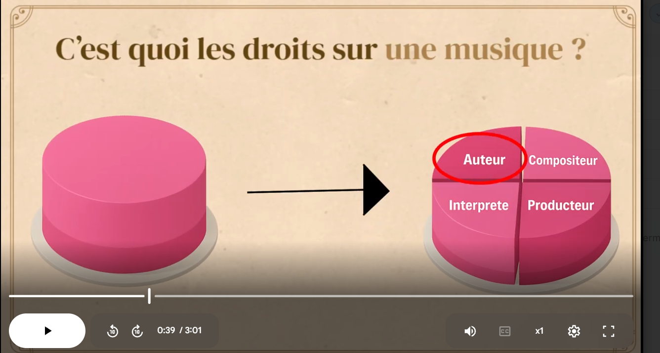 Enfin, la vidéo repose sur un travail de narration visuelle : chaque notion (auteur, compositeur, interprète, producteur) est illustrée par des animations graphiques, comme des schémas ou des métaphores visuelles, afin de rendre les concepts plus concrets. Ce projet m’a permis de développer à la fois des compétences techniques en motion design et une réflexion sur la manière de transmettre efficacement un contenu informatif.
